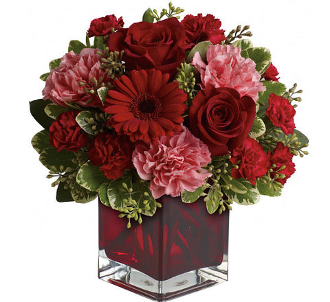 Hoping to be together forever? Whether you'd like to send a flowery message of love to a favorite beau, best friend or family member on Valentine's Day, this sentiment of your affection - delivered in a special red cube vase - will make them blush with happiness. A mix of roses, carnations and more in shades of red and pink accented with greenery is delivered in a cube vase.