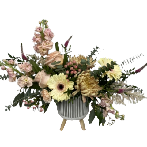 Embrace the beauty of subtle elegance with this sophisticated arrangement of stock, roses, gerberas, disbuds, berries, and greens in a stylish container. A perfect blend of soft tones and textures, it brings timeless charm to any space.
