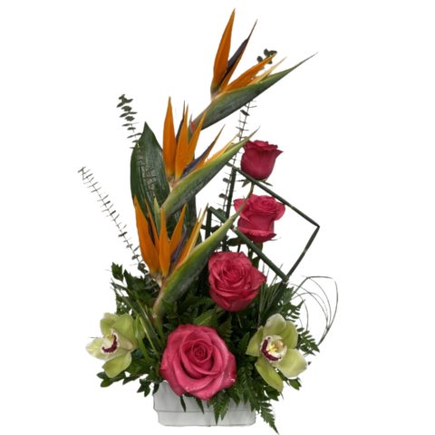 Bring the tropics to Mom this Mother’s Day with a stunning blend of birds of paradise, vibrant roses, and cymbidium orchids, artfully arranged with lush greenery. This vibrant bouquet, full of exotic beauty and lively color, is beautifully accented with decorative greens, creating a bold and elegant tribute to the amazing woman in your life.
